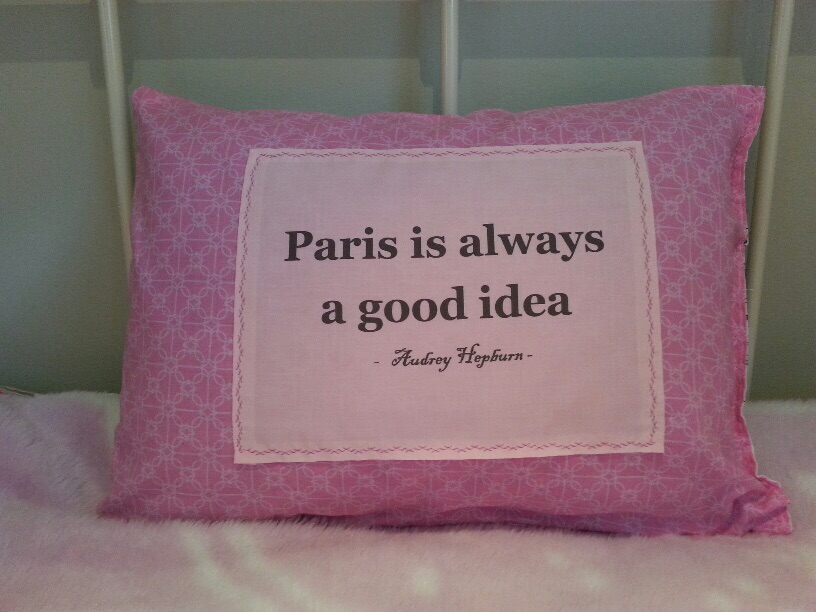 Designer Pillows My sister loves Audrey Hepburn and wanted her Paris quote on a pillow. Here is what I came up for her. Share this: Click to share on X (Opens in new window) X Click to share on Facebook (Opens in new window) Facebook Like Loading...